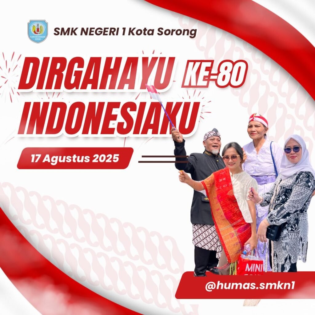 Keluarga Besar SMK Negeri 1 Sorong Mengucapkan Dirgahayu Republik Indonesia Ke 80,Semoga Indonesia! Bersama, kita wujudkan rakyat sejahtera dan Indonesia maju.