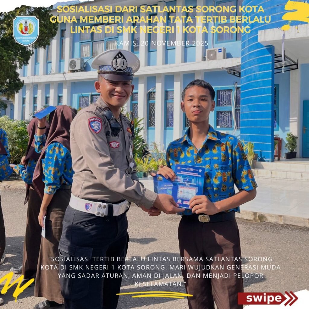 Satlantas Sorong melaksanakan kegiatan “Sosialisasi tertib berlalu lintas bersama Satlantas Sorong Kota di SMK Negeri 1 Kota Sorong. Mari wujudkan generasi muda yang sadar aturan, aman di jalan, dan menjadi pelopor keselamatan.” Adapun kegiatan ini di ikuti oleh seluruh Peserta Didik SMK Negeri 1 Sorong. Source : https://www.instagram.com/p/DRQgi9sgX-l/?utm_source=ig_web_copy_link&igsh=MzRlODBiNWFlZA==