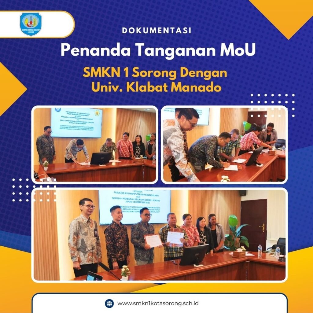 Dalam rangka meningkatkan kerja sama dalam bidang Praktek Kerja Lapangan (PKL),Pihak SMK Negeri 1 Sorong melakukan MoU dengan pihak Univ. Klabat Manado. yang mana dalam penanda tanganan ini dihadiri oleh Plt.Kepala SMK Negeri 1 Sorong Bapak Drs. Austinus H.P. Ompusunggu,M.M dan Wakasek Humas Ibu Starlet Resubun,S.Pd dan pihak kampus Univ.Klabat.