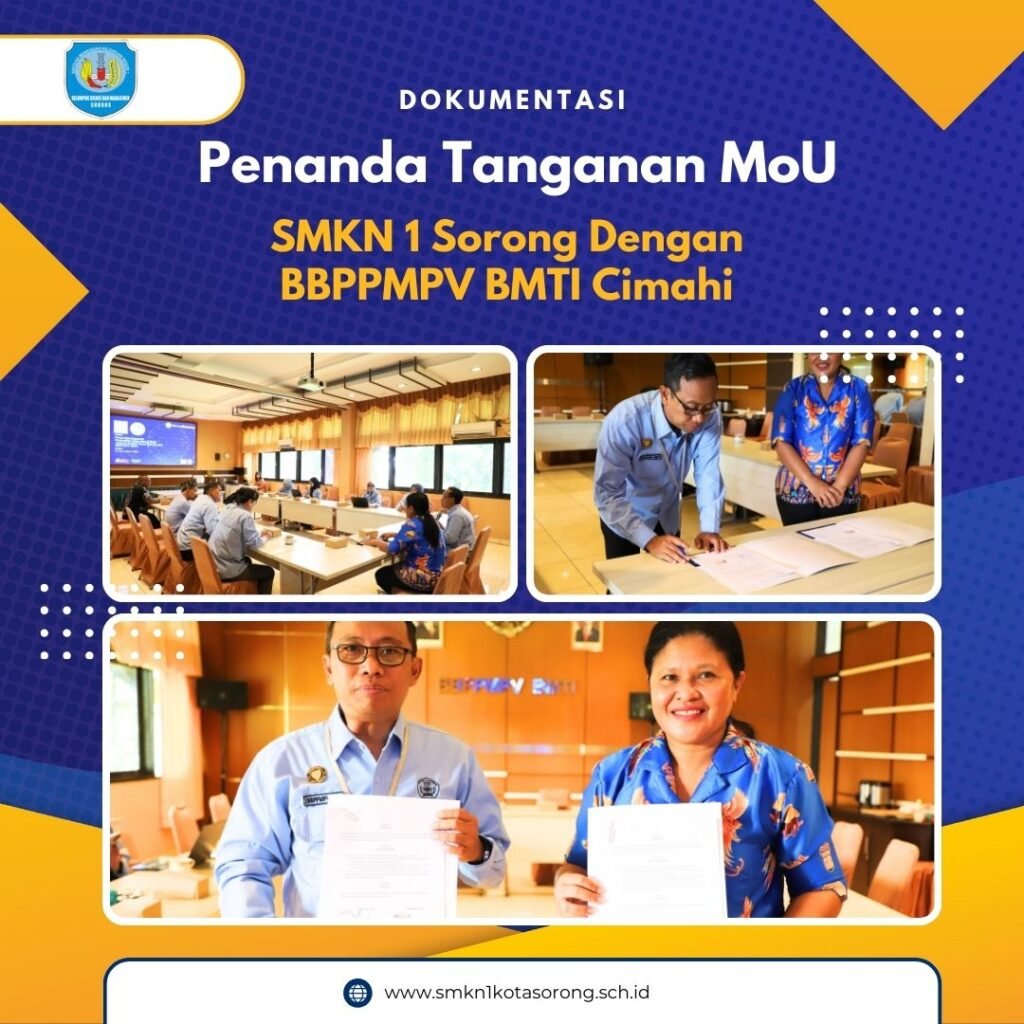 Dalam rangka meningkatkan kerja sama dalam bidang Praktek Kerja Lapangan (PKL),Pihak SMK Negeri 1 Sorong melakukan MoU dengan pihak BBPPMPV BMTI Cimahi . yang mana dalam penanda tanganan ini dihadiri oleh Wakasek Humas Ibu Starlet Resubun,S.Pd dan pihak BBPPMPV BMTI Cimahi .