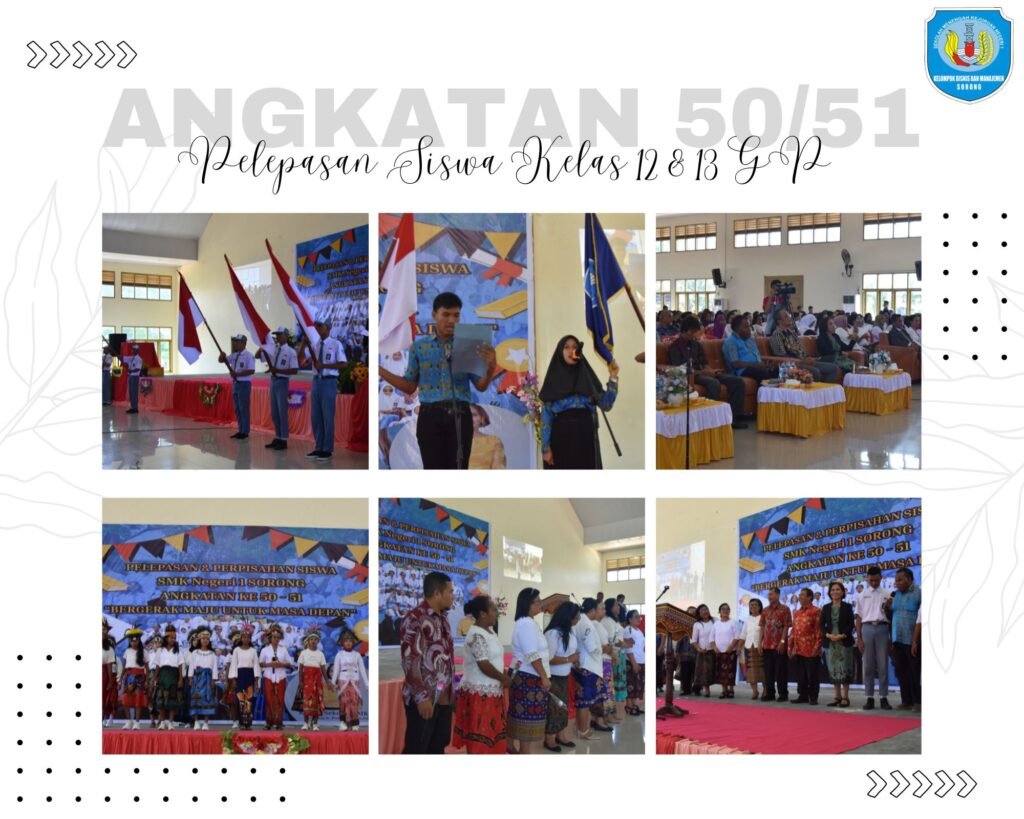 Pada tanggal 4 Mei 2024 bertempat di Gedung Tongkonan,SMKN 1 Sorong melaksanakan Pelepasan siswa kelas 12 & 13 Geologi Pertambangan.dimana hadir juga orang tua siswa beserta guru dan staf TU SMKN 1 Sorong.dalam acara ini di isi dengan beberapa tarian dari P5 dan beberapa acara seperti janji almamater yg di bacakan oleh siswa kelas 12.