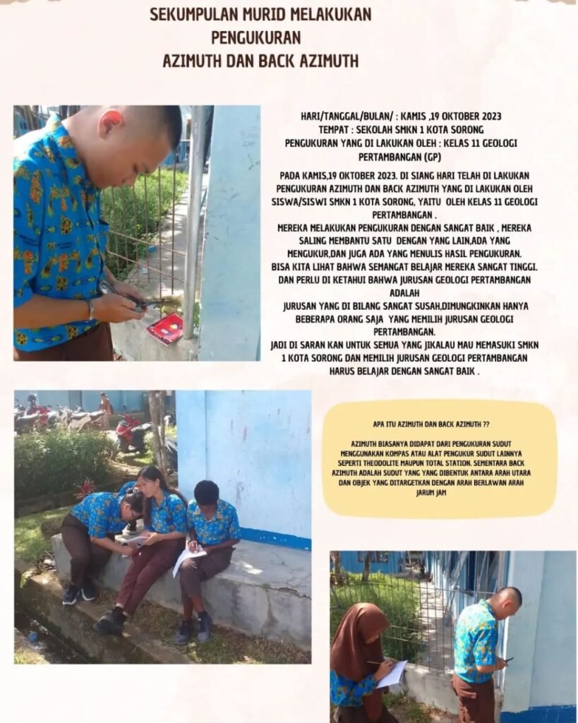 Pada/kamis,11 Januari 2024,pada siang hari di sekolah SMKN 1 kota Sorong telah dilakukan pengukuran azimuth dan back azimuth oleh siswa/siswi kelas 11 Geologi pertambangan. Mereka melakukan pengukuran azimuth dan back azimuth dengan sangat baik, mereka saling membantu satu dengan yang lain,ada yang mengukur dan ada juga yang menulis hasil pengukuran azimuth dan back azimuth,bisa kita […]