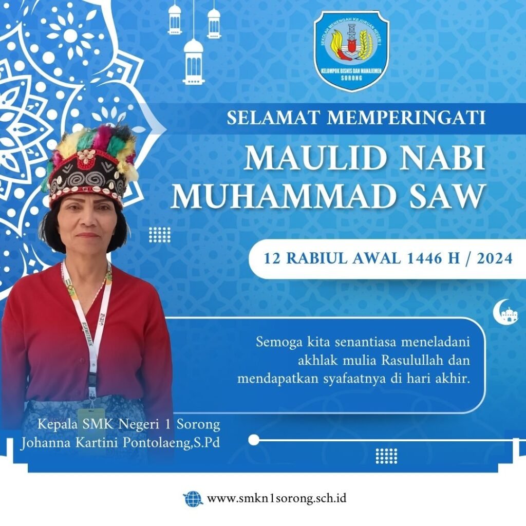 SMK Negeri 1 Sorong Mengucapkan Selamat Maulid Nabi Muhammad SAW 12 rabiul awal 1446H/2024, Jadikan Maulid Nabi Muhammad sebagai momentum untuk memperbaiki diri dan meneladani kehidupan Nabi Muhammad agar selamat dunia dan akhirat.