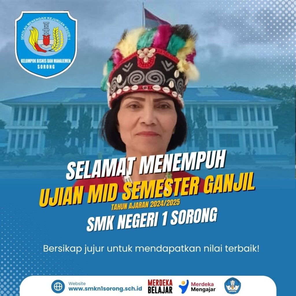 Pada tanggal 24 September 2024 Siswa/i SMKN 1 Sorong kelas 10,11 & 12 GP akan melaksanakan Ujian Mid Semester Ganjil,ujian ini dilakasanakan selama 4 hari.semoga ujian dapat berjalan dengan lancar pesan dari Ibu Kepala SMKN 1 Sorong Johanna Kartini Pontolaeng,S.Pd.