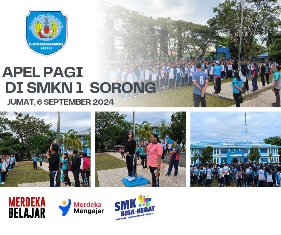 Pada hari Jumat tanggal 6 September 2024 telah dilaksanakan apel bersama yang di pimpin oleh Kepala SMKN 1 Sorong Ibu Johanna Kartini Pontolaeng,S.Pd beserta guru dan siswa. Adapun agenda apel pagi adalah tentang disiplin siswa dan penggunaan seragam di hari yang telah ditentukan.dilanjutkkan dengan kerja bakti bersama dilingkungan SMKN 1 Sorong.